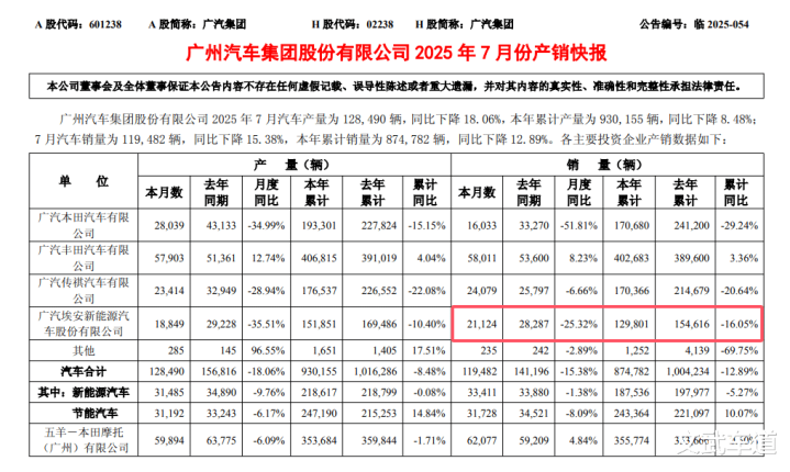 根据最新的销量数据显示,在7月份广汽埃安的销量仅为21124辆,同比下滑了25.32%。而前7个月的整体销量为129801辆,同比下滑了16.05%。这样的表现,在同级市场上已经显得相当难堪。而值得关注的是,广汽埃安的销量下滑幅度还在呈现继续扩大的势头。在6月份广汽埃安的销量仅为19886辆,相比去年同期,销量下滑了22.6%。